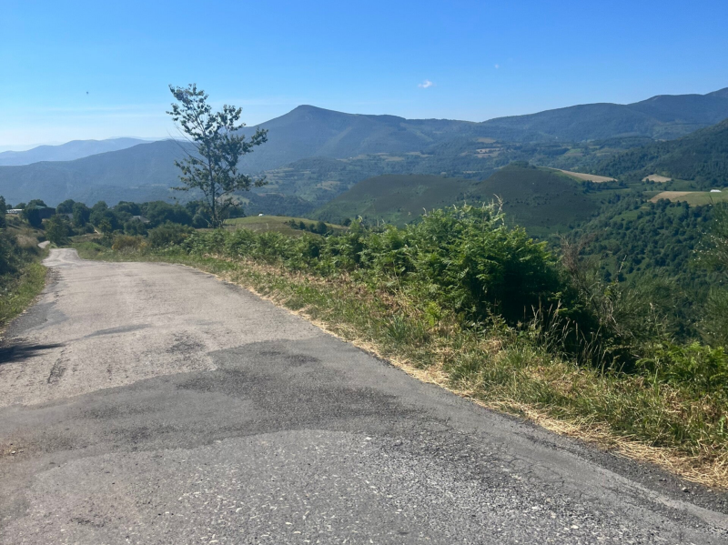 Die Straße wird dann immer kleiner, dann kommt ein Abzweig und der Hauptanstieg des Tages beginnt. Meist im Wald, also schattig (zum Glück!) geht's erstmal zwischen 8 und 10% rauf, dann endet der Wald und das Finale mit bis 12% führt auf die Anhöhe rauf, von wo der Blick sensationell ist, und unten in den Tälern noch die Wolken hängen...