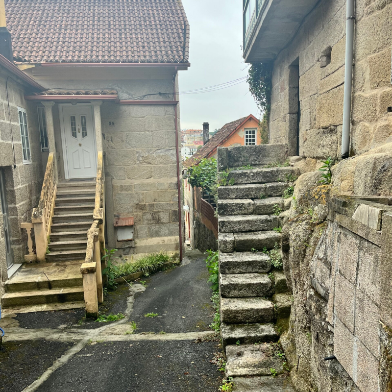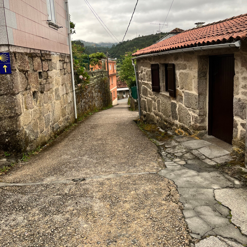 Nachdem ich im 22er(!) Schlafsaal in Pontevedra erstaunlich gut geschlafen habe, konnte ich zeitig starten. Es ist morgens ich ziemlich kühl, starte also mit Langarm-Shirt drüber. Ähnlich wie auf der vorigen Etappe geht es ständig rauf oder runter, mal durch den Wald, mal durch Ortschaften. Da ist es oft ziemlich gemein, weil es immer wieder kurze sehr steile Verbindungsgassen gibt, die Komoot einen raufschickt, die sind teils an der Grenze des fahrbaren, aber zum Glück meist kurz. Runter ähnlich, da muss man ordentlich Bremsen und kann halt auch nur quasi Schrittempo fahren.